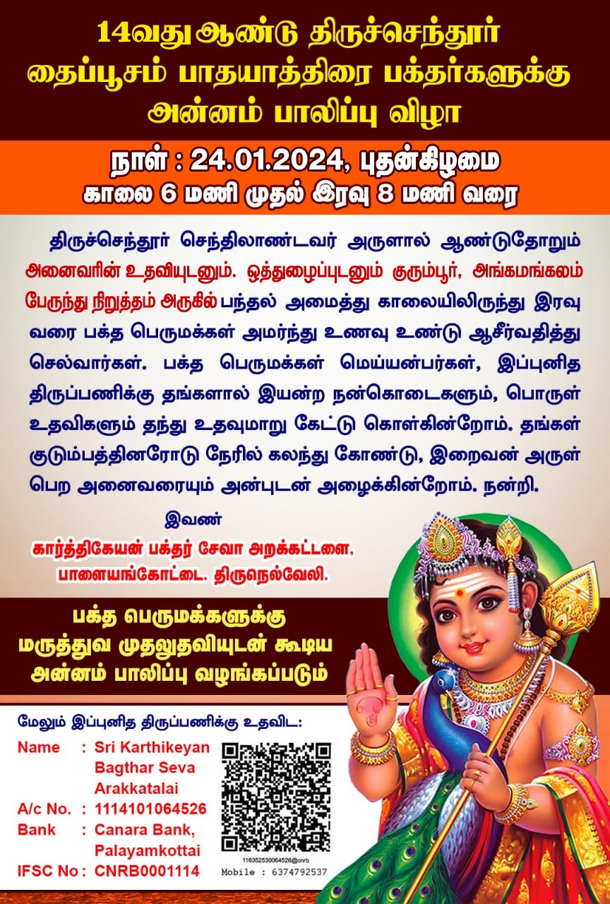அன்னதானம் இந்த வருடம் 24.01.2024. புதன்கிழமை காலை 6மணி முதல் இரவு 8 மணிவரை திருநெல்வேலி,ஶ்ரீவைகுண்டம், குரும்பூர் வழியாக